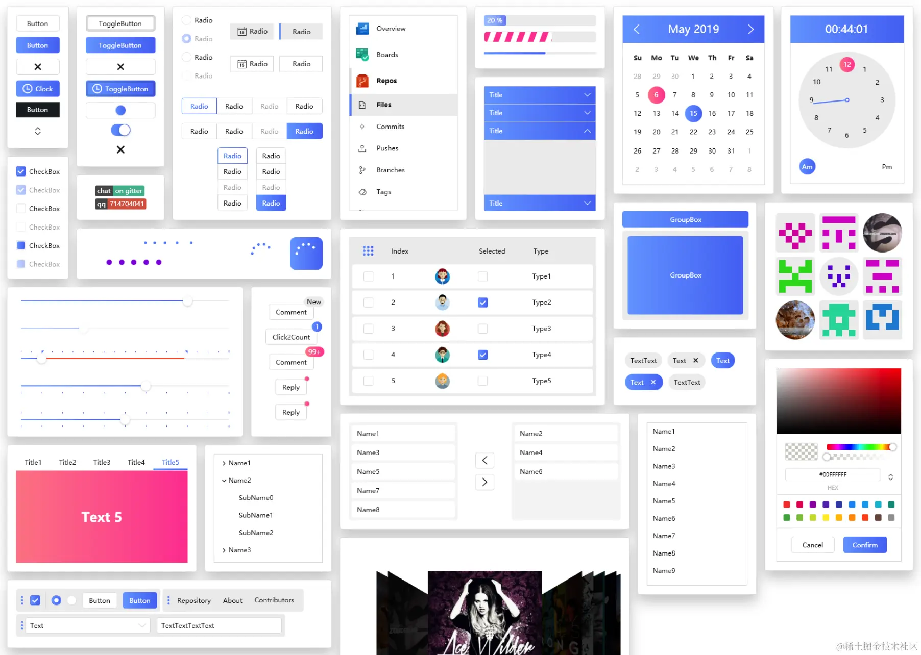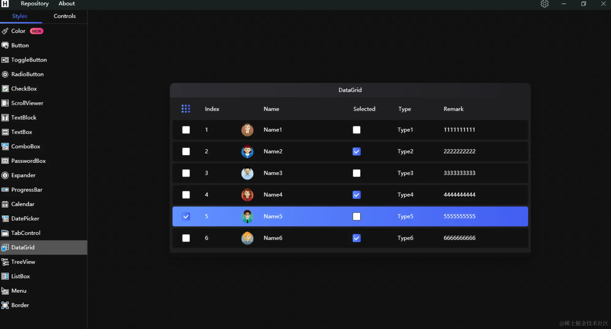 - 1.丰富的 UI 组件:HandyControl 提供了完整的 WPF 控件集合,包括标准的如 Button、TextBox,也包括一些高级的控件如 Calendar、DataGrid、ListView 等。这为开发者提供了全面的 UI 构建工具。