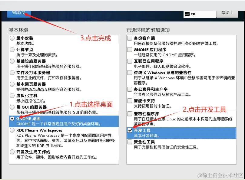 4.点击软件选择,选择GNOME桌面,选择开发工具,点击完成,如下图所示: