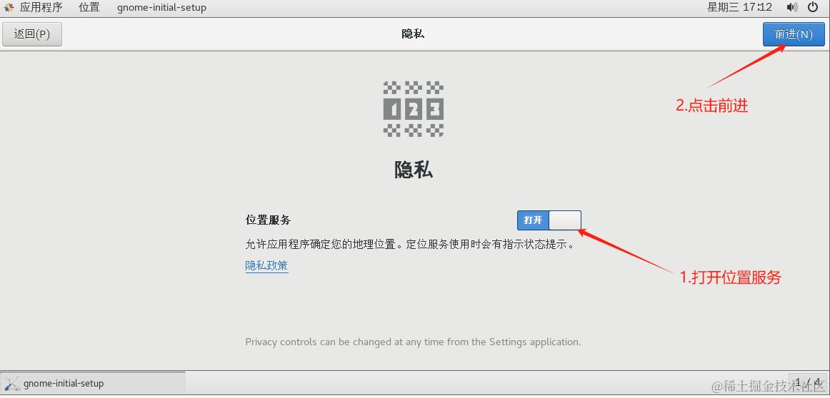 13.前进到隐私处,打开位置服务,点击前进,最后点击开始使用,如下图所示: