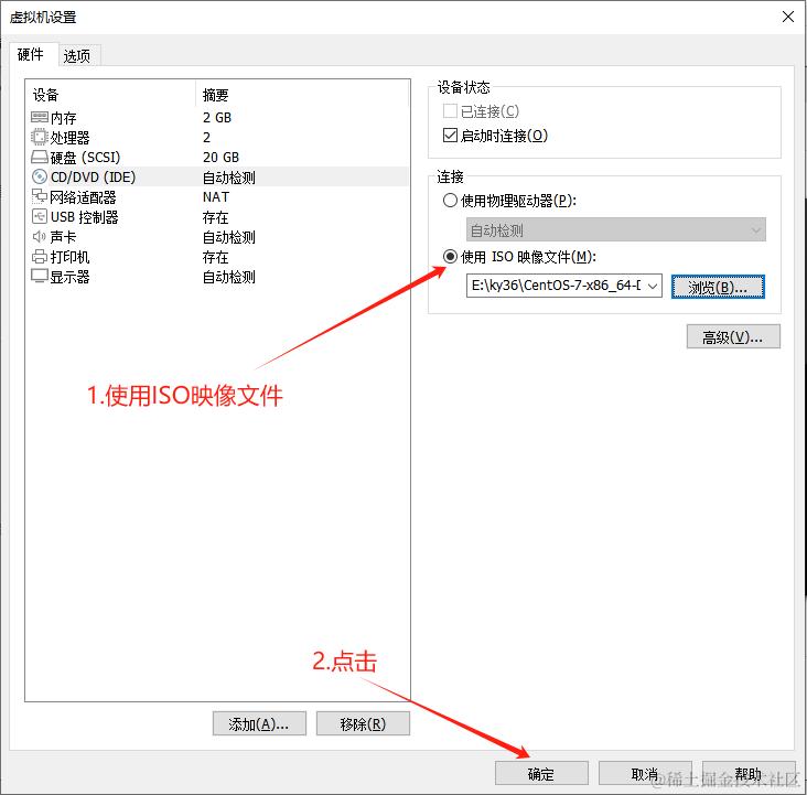 11.点击CD/DVD选项,右侧选择使用ISO映像文件,选择上面准备好的CentOS-7-x86_64-DVD-1708包,点击关闭,如下图所示: