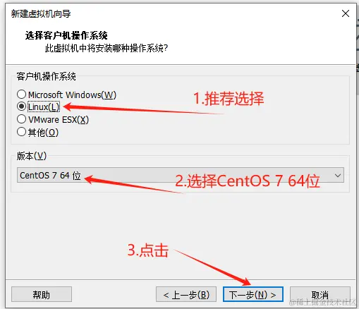 4.选择要安装的系统Linux,选择linux的版本,版本安装的是7版本64位,点击下一步,如下图所示: