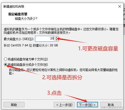 6.选择磁盘的大小,可以自己设置,此次设置为20G,拆分成多个文件,点击下一步,如下图所示: