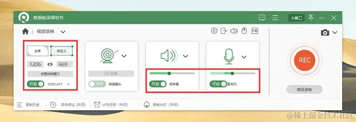 步骤2:在这里,用户可以自由选择适合的屏幕区域进行录制,并对音频设备进行调整,然后点击 “REC” 按钮开始录制。