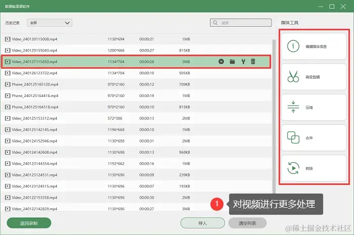 步骤4:如果需要压缩或者合并录制的视频,可以来到历史记录页面,在这里能对视频进行更多操作。