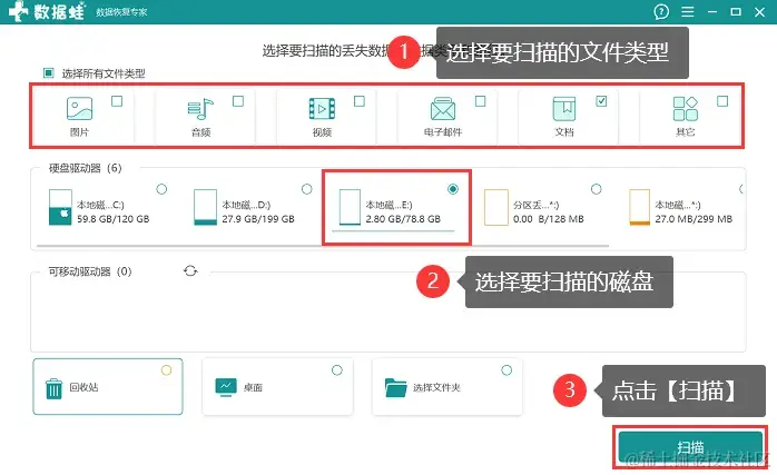 第2步:对要扫描的文件类型和磁盘进行勾选,若是外部设备,先与电脑连接后再进行选择,完成选择后,点击【扫描】 ;