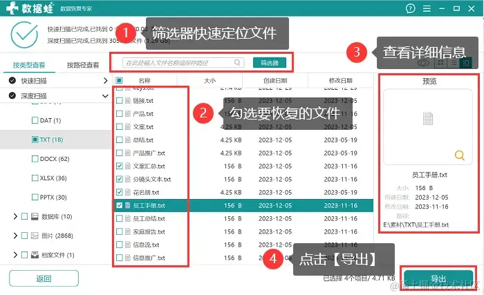 第3步:耐心等待软件对所选的磁盘进行扫描,扫描完成后,可以先选择要查看的文件类型,并对扫描结果进行勾选,将所有需要恢复的文件都勾选上,点击 【导出】,并选择导出后的保存位置。(保存位置与扫描位置应该位于不同的磁盘)