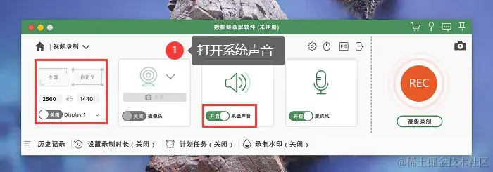 第2步:在视频录制模式中,我们可以自定义录制的屏幕区域,如果你不希望录制到电脑的外部声音,那么只需要开启系统声音就可以了。