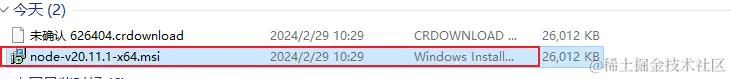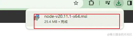 - 点击LTS按钮下载Windows安装程序(.msi文件)。确保选择与你的Windows架构(32位或64位)相匹配的版本,在浏览器的右上角点击在 [ 在文件夹中显示 ]