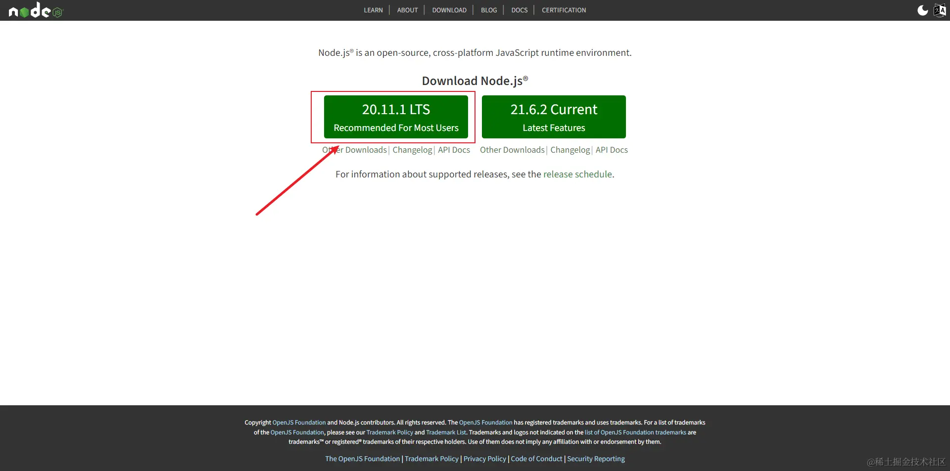 你会看到两个版本可供下载:LTS(长期支持)和Current。对于初学者,我推荐LTS版本,因为它的稳定性和延长的支持。