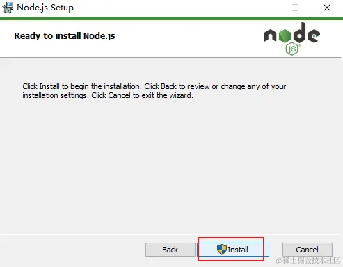 在“准备安装Node.js”屏幕上,点击“安装”,需要提供管理员权限,等待安装完成。