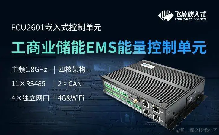 FCU2601嵌入式控制单元是飞凌嵌入式为锂电池储能行业设计的EMS能量管理单元,兼具高性能、多接口、低功耗的优势,广泛适用于工商业储能、电网侧储能、源网侧储能等各类储能系统的本地能源管理应用需求。