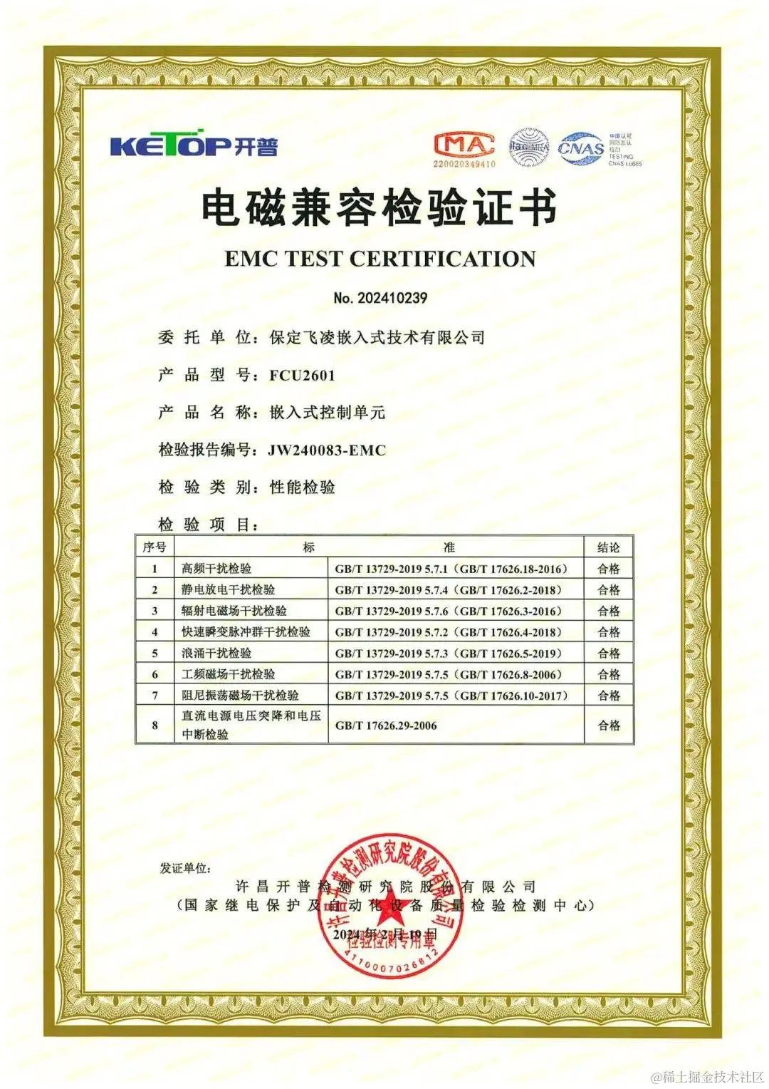 近日,飞凌嵌入式专为锂电池储能行业设计的FCU2601嵌入式控制单元获得了开普电磁兼容检验证书,此次性能检验项目包括高频干扰检验、静电放电干扰检验、辐射电磁场干扰检验、快速瞬变脉冲群干扰检验、浪涌干扰检验、工频磁场干扰检验、阻尼振荡磁场干扰检验和直流电源电压突降和中断检验共8个电磁兼容测试,以及绝缘电阻检验、介质强度检验和冲击电压检验3项电气性能及安全测试——FCU2601嵌入式控制单元通过全部测试。