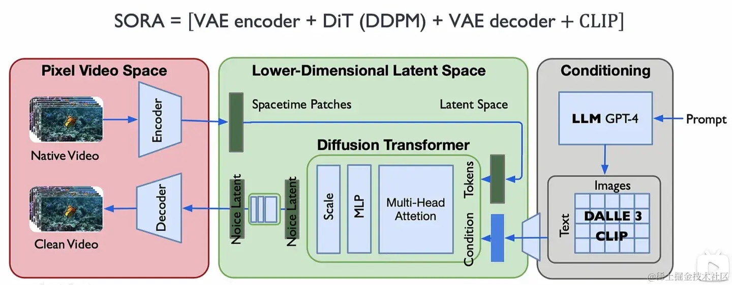 在Conditioning阶段,可能不是一帧对应一个文本,而是几帧甚至十几帧对应一段文本描述。在编码成时空潜在补丁时,可能使用了ViT的时空编码方式。输入给解码器(encoder)的内容应该是去噪之后的补丁序列,用补丁(patches)描述比使用Tokens更准确一些。