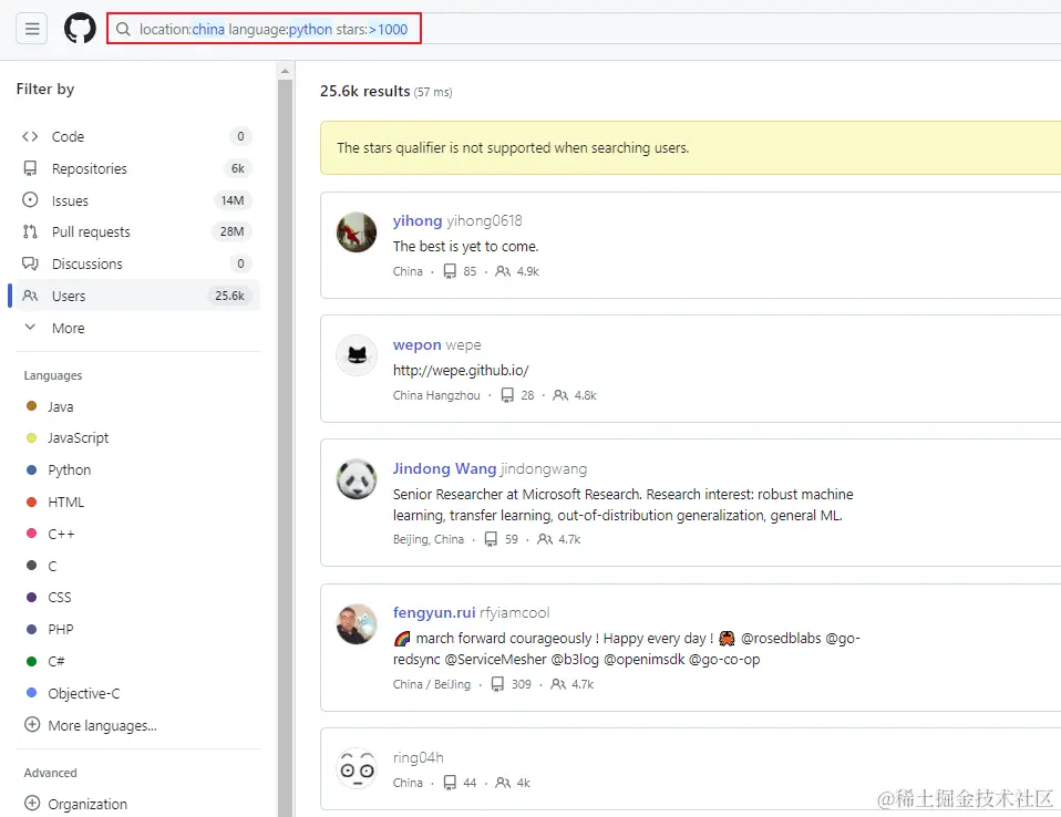 - 例如使用 python 编程语言,且star数量大于1000的国产项目,搜索条件就是:location:china language:python stars:>1000