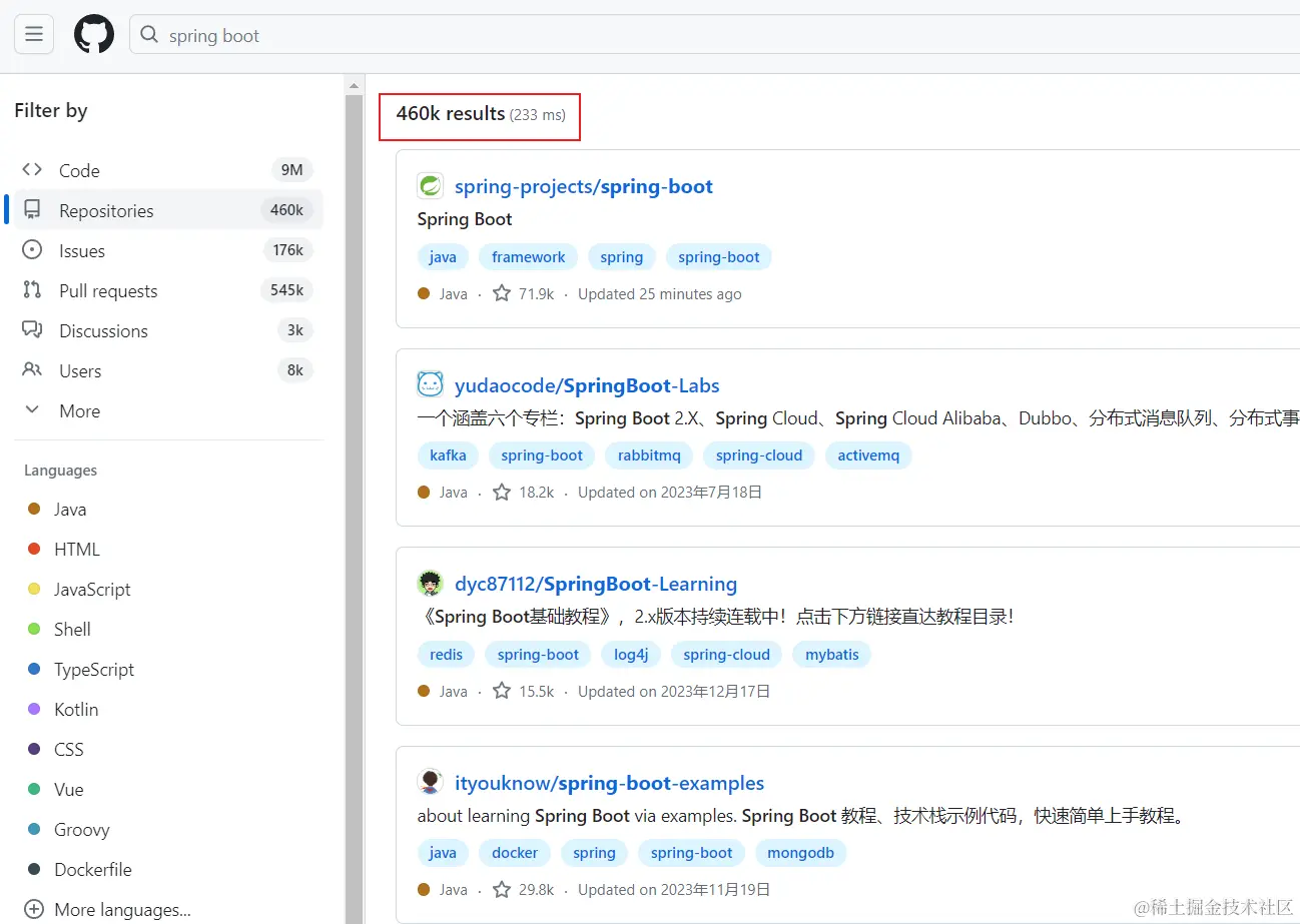 做一个限制,这次搜索项目名里含有 spring boot 的