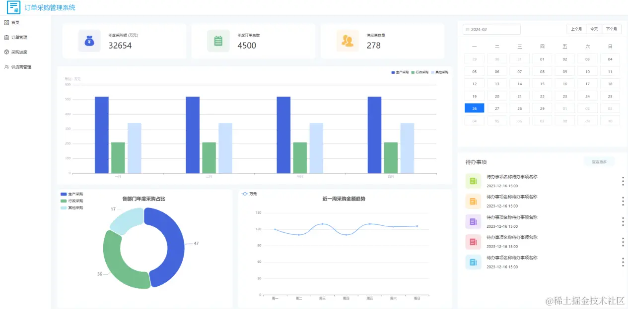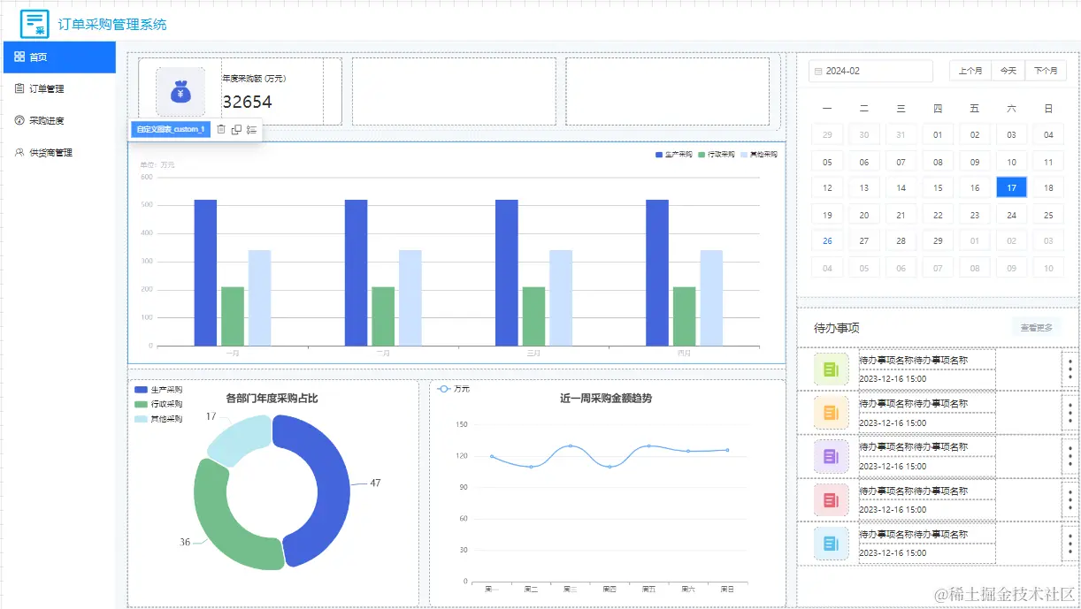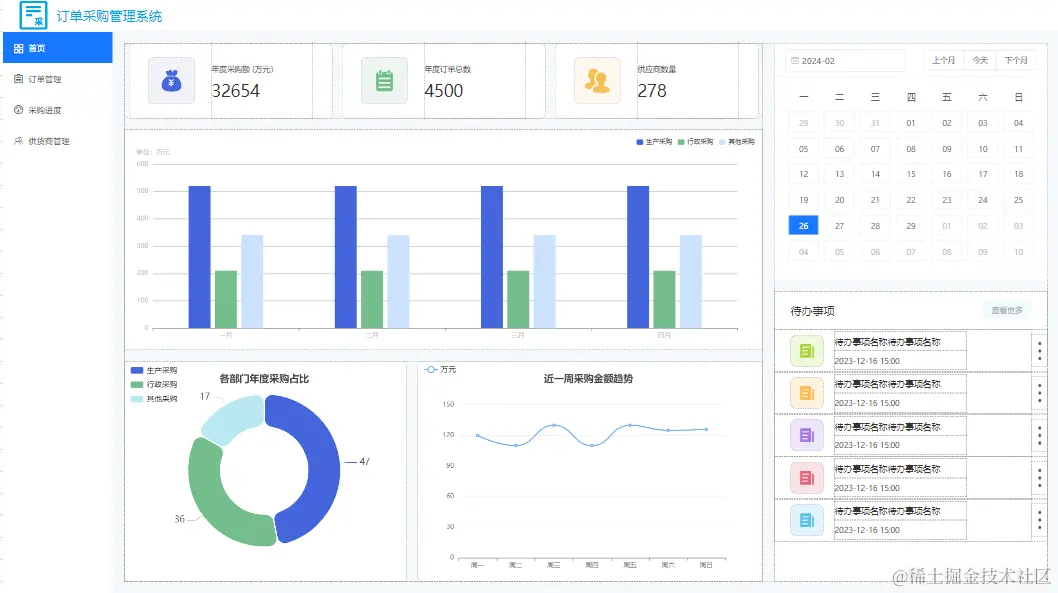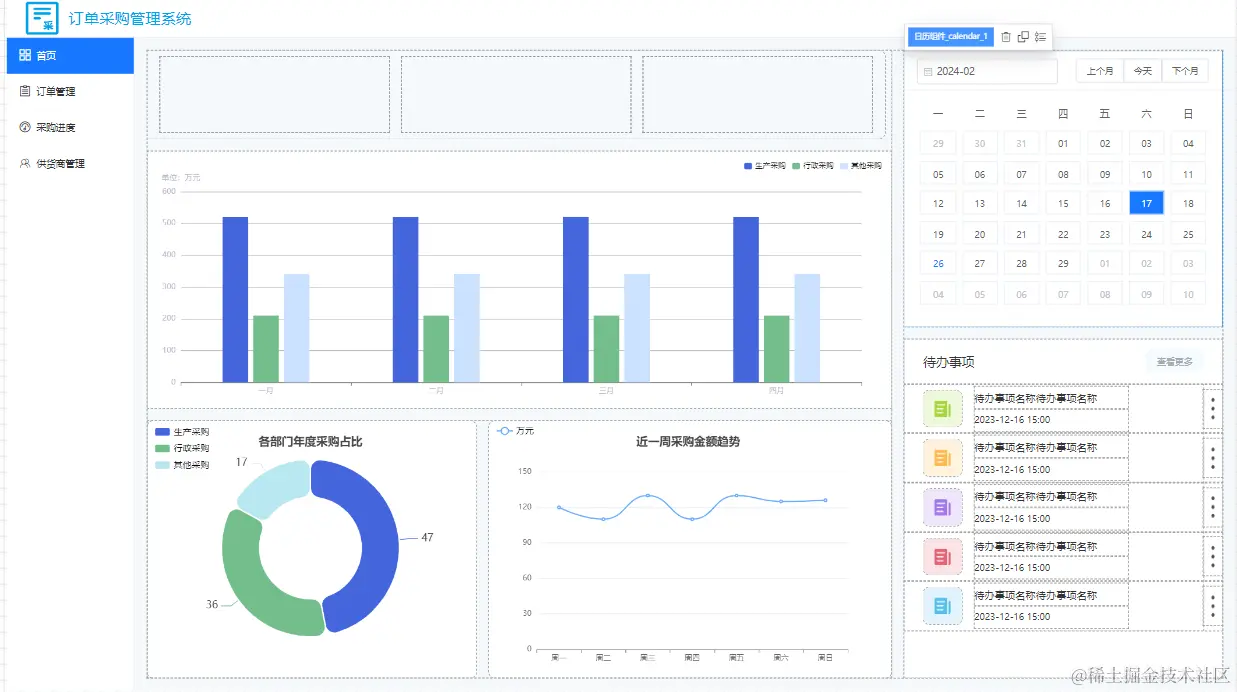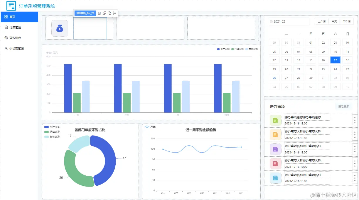 在发现栅格容器之前,我都是用弹性容器做成的统计块,我最近仿照模版中心制作的订单采购管理系统的首页,就是利用弹性容器拼接成的,拼接出来的效果是这样的: