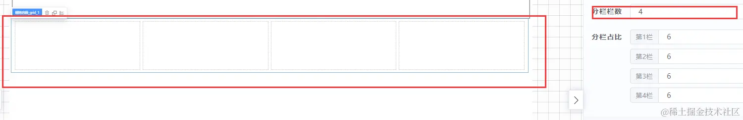 属性配置包括组件名称、分栏间隔、分栏栏数和分栏占比。