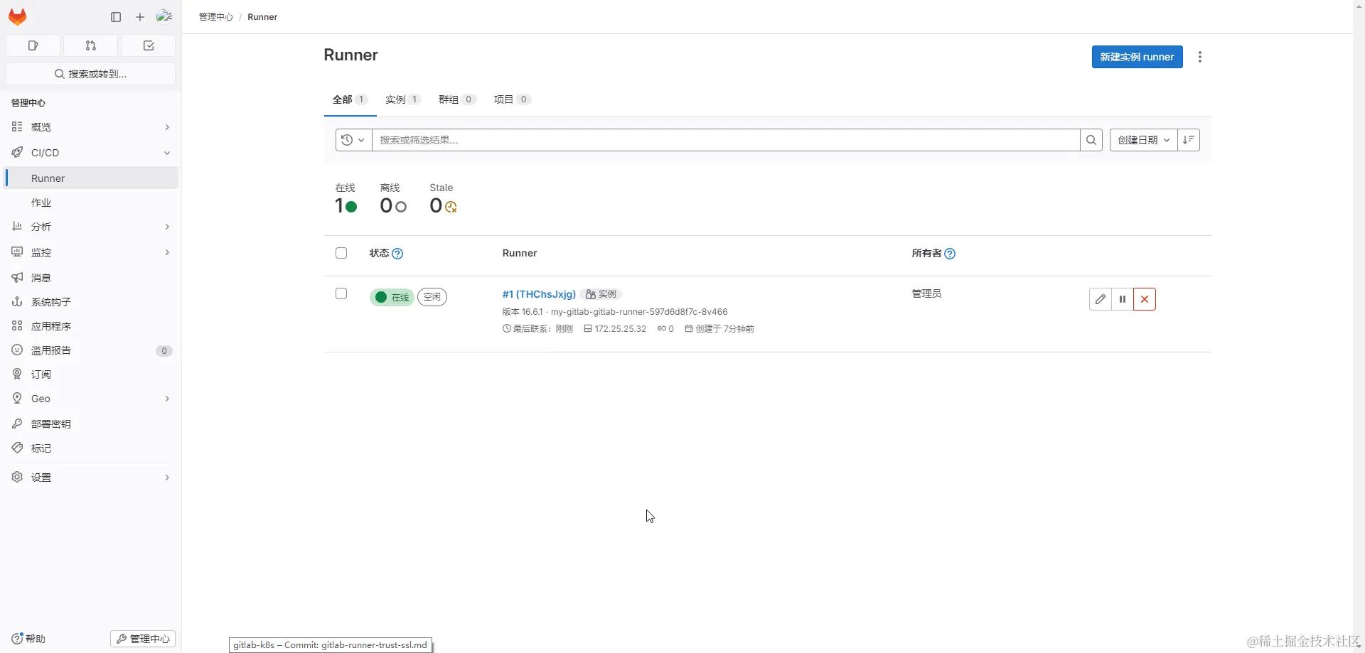 管理员访问 gitlab.test.helm.xuxiaowei.cn/admin/runne… 可以看到 pod
