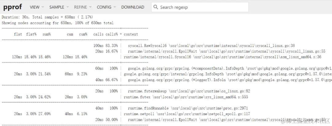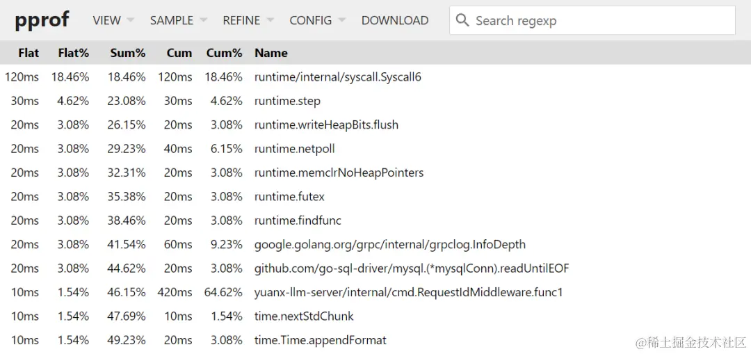 等 10s 后会生成一个 pprof.server.samples.cpu.001.pb.gz 文件(默认在 C:\Users\pprof 目录下,注意后面有用到),和之前一样,我们可以用 top 命令查看最近一段时间的 CPU 耗时: