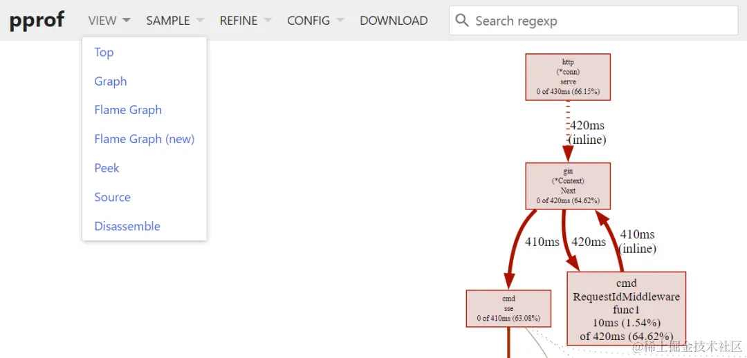 通过 PProf 所提供的可视化界面,我们能够更方便、更直观的看到 Go 应用程序的调用链、使用情况等。另外在 View 菜单栏中,PProf 还支持多种分析方式的切换,如下: