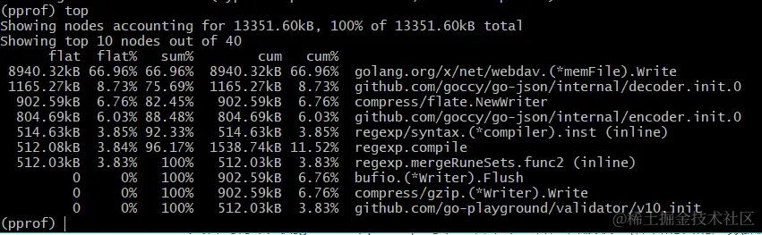 更进一步,go tool pprof提供了一个交互式界面,你可以运行 top 命令来查看内存使用最多的几个函数。例如: