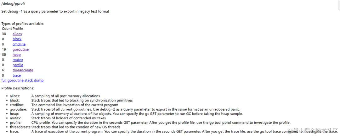 启动后,通过访问 http://localhost:8080/debug/pprof/,你将看到服务器当前的运行状态,包括 goroutine、堆栈、GC 等信息: