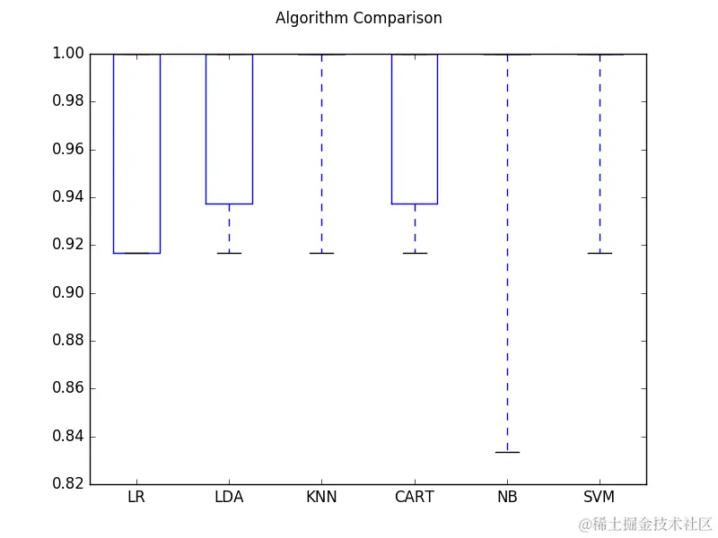 你可以看到箱线图的顶部范围 呈压缩状,不少模型都达到了 100% 的准确率。