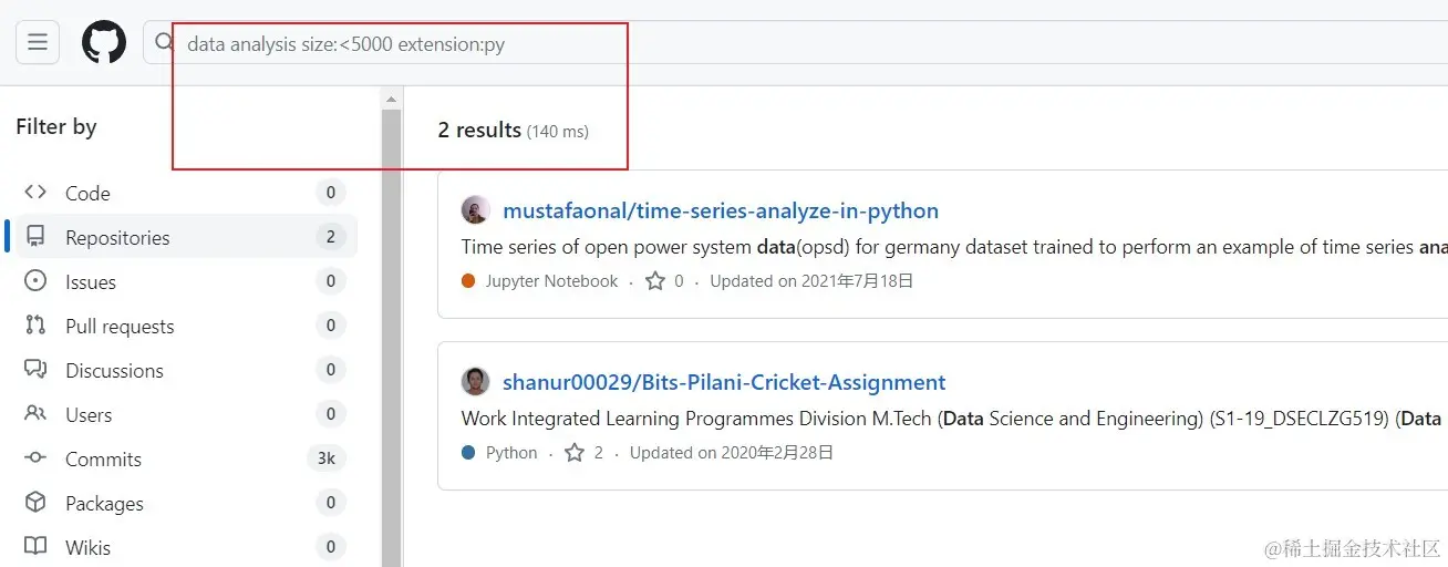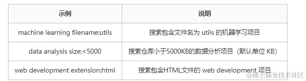 关键字 filename:文件名 - 按照仓库大小搜索:语法: