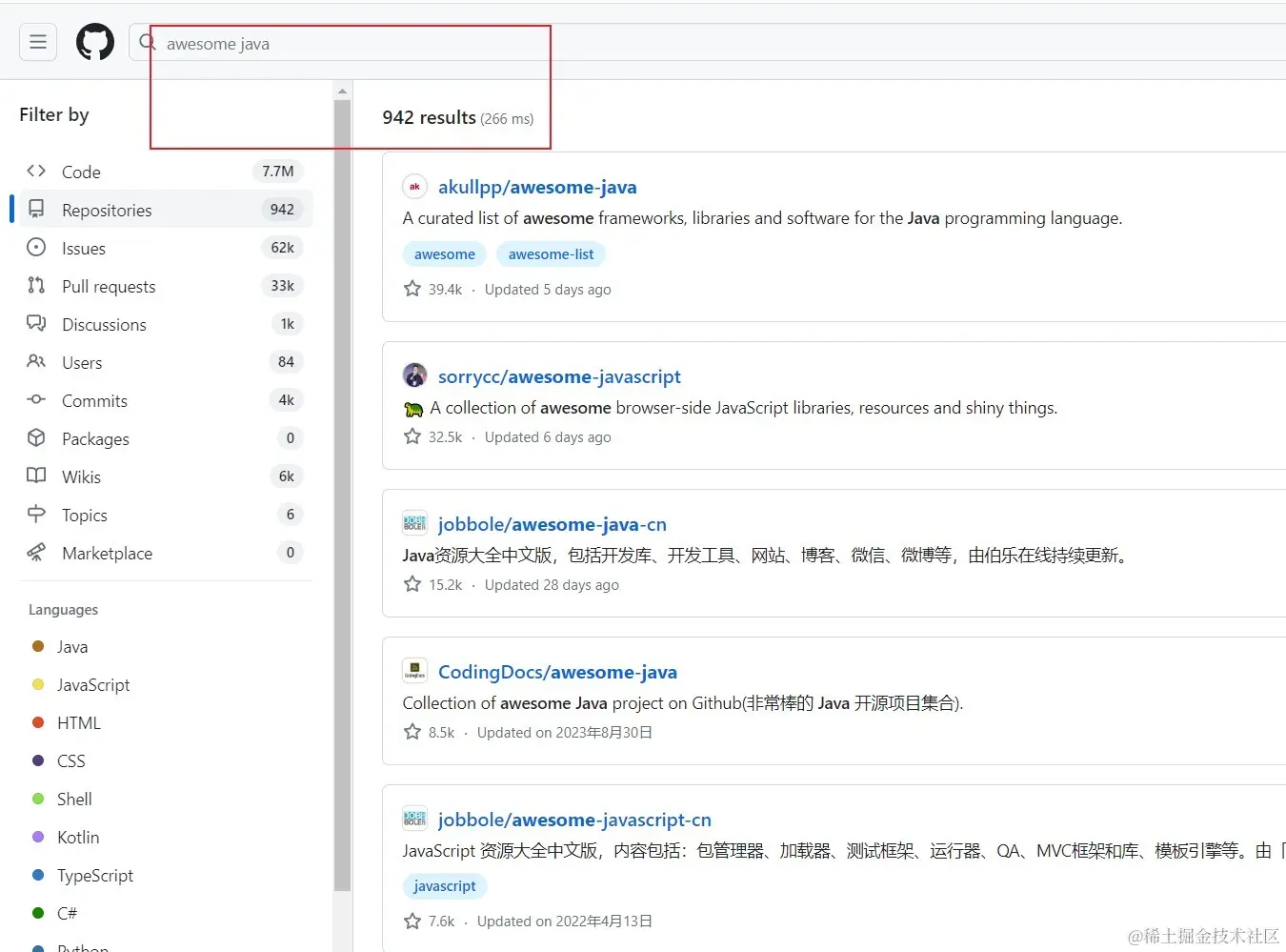 awesome往往整合了大量的同一领域的资料,收集学习、工具、书籍类相关的项目,方便大家更好的学习。- 比如搜索优秀的java相关的项目,包括框架、教程等