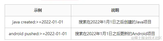 关键字 created:>=日期 - 按照项目更新时间搜索:语法: