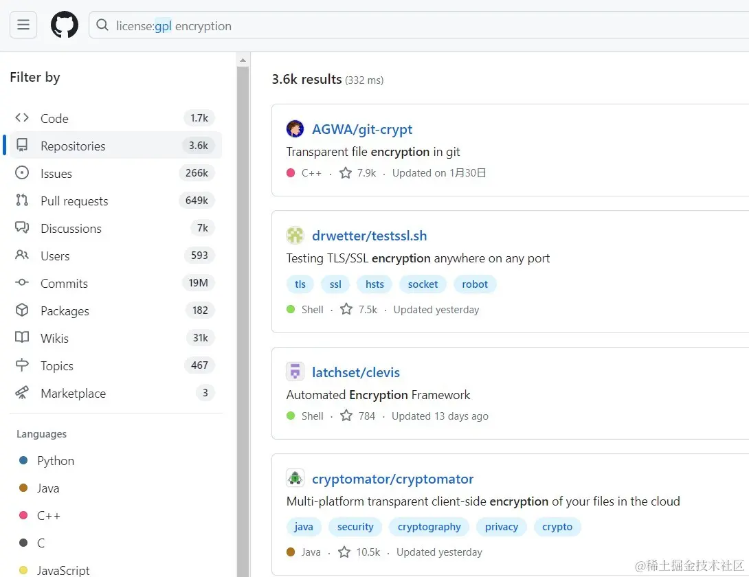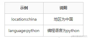 - 例如使用 python 编程语言,且star数量大于1000的国产项目,搜索条件就是:location:china language:python stars:>1000