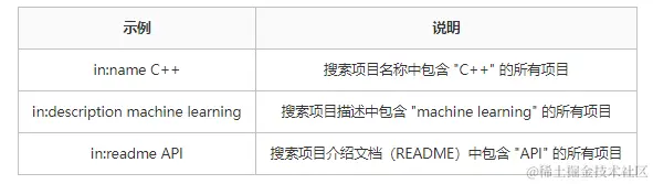 in关键词可以用来限制搜索范围,精准搜索仓库名称name,说明description 以及README 文件中的内容。description 就是github界面图中, About 中的信息。