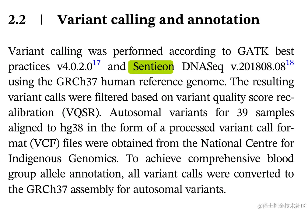 红细胞(RBC)膜相关血型系统具有临床意义。由于这些红细胞相关血型之间的抗原多态性,同种免疫是与输血相关的持续风险。下一代测序 (NGS) 提供了表征特定个体血型变异特征的机会。澳大利亚人口众多,其中大多数献血者是白种人,而澳大利亚原住民对血型变异的研究仍然很少。在这项研究中,研究者关注的是提维岛民,他们几千年来一直生活在相对孤立的环境中。在这项研究中,研究者发现新不伦瑞克省东南部的阿卡迪亚人样本人群携带 28 种常染色体隐性遗传病和 1 种 X 连锁病的变异,其中一些与参考人群相比明显更常见。在该研究中,研究者使用Sentieon软件进行胚系变异检测。