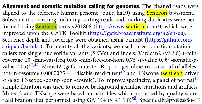 由于当前研究中的样本或目标基因有限,结直肠癌(CRC)的遗传基础及其临床关联仍然知之甚少。作为长康项目的一部分,研究者对 1015 名 CRC 患者进行超深全外显子组测序。确定了 46 个高可信度的显着突变基因,其中 8 个在 14.9% 的患者中发生突变:LYST、DAPK1、CR2、KIF16B、NPIPB15、SYTL2、ZNF91 和 KIAA0586。通过无监督聚类算法,研究者提出了一种亚型分型策略,将 CRC 患者分为四种具有不同临床特征的基因组亚型,包括超突变、高风险染色体不稳定、低风险染色体不稳定和基因组稳定性。免疫原性分析揭示了免疫原性降低与结直肠癌基因组亚型和不良预后之间的关联。此外,研究者发现线粒体DNA拷贝数是预测CRC存活结果的独立因素。 在该研究中,研究者使用Sentieon软件进行比对、排序、去重以及体细胞变异检测。