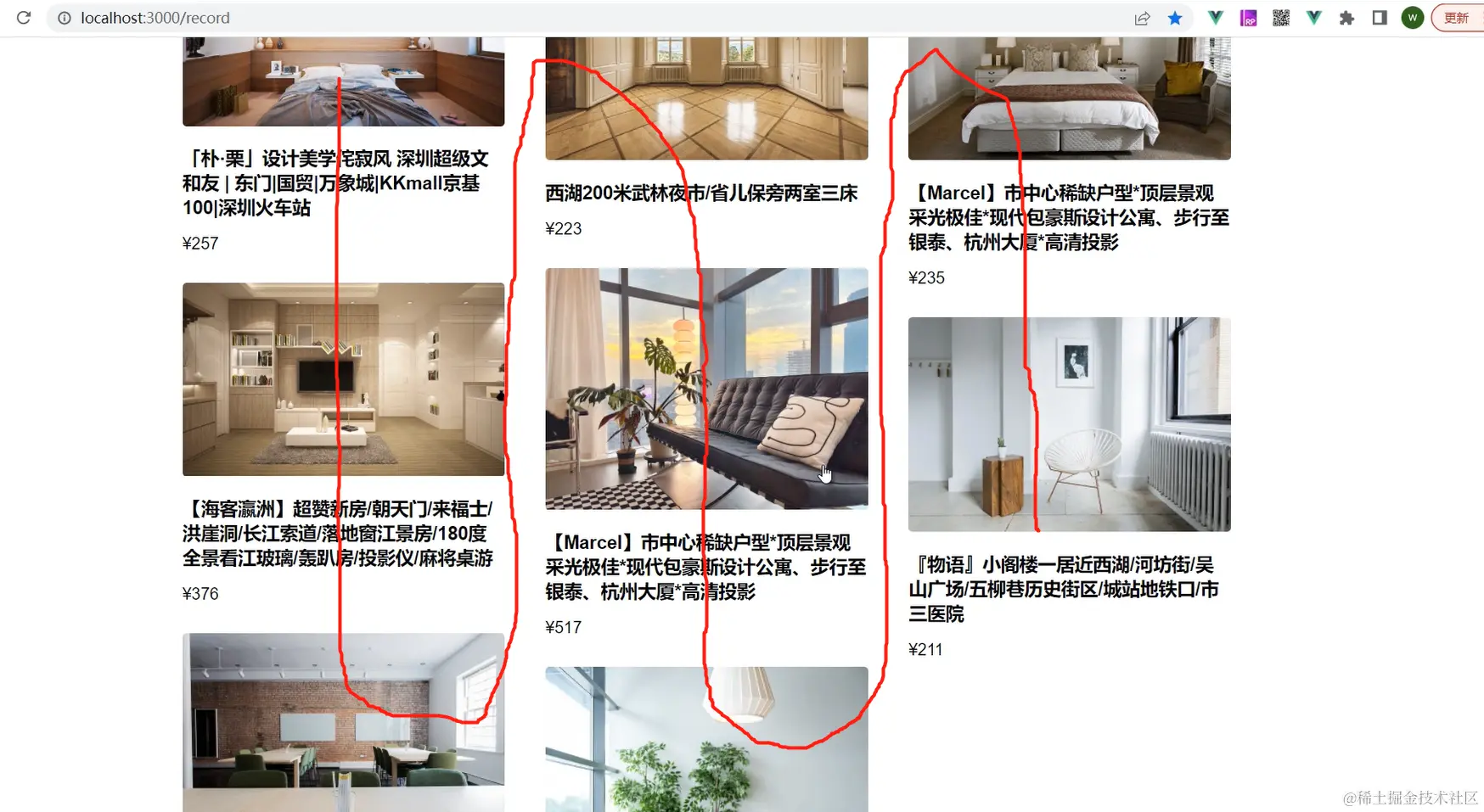 小红书和京东的瀑布流实现方式是有多少列就写多少个 div,然后再将每个元素放在每列中依次往下排列,如图所示: