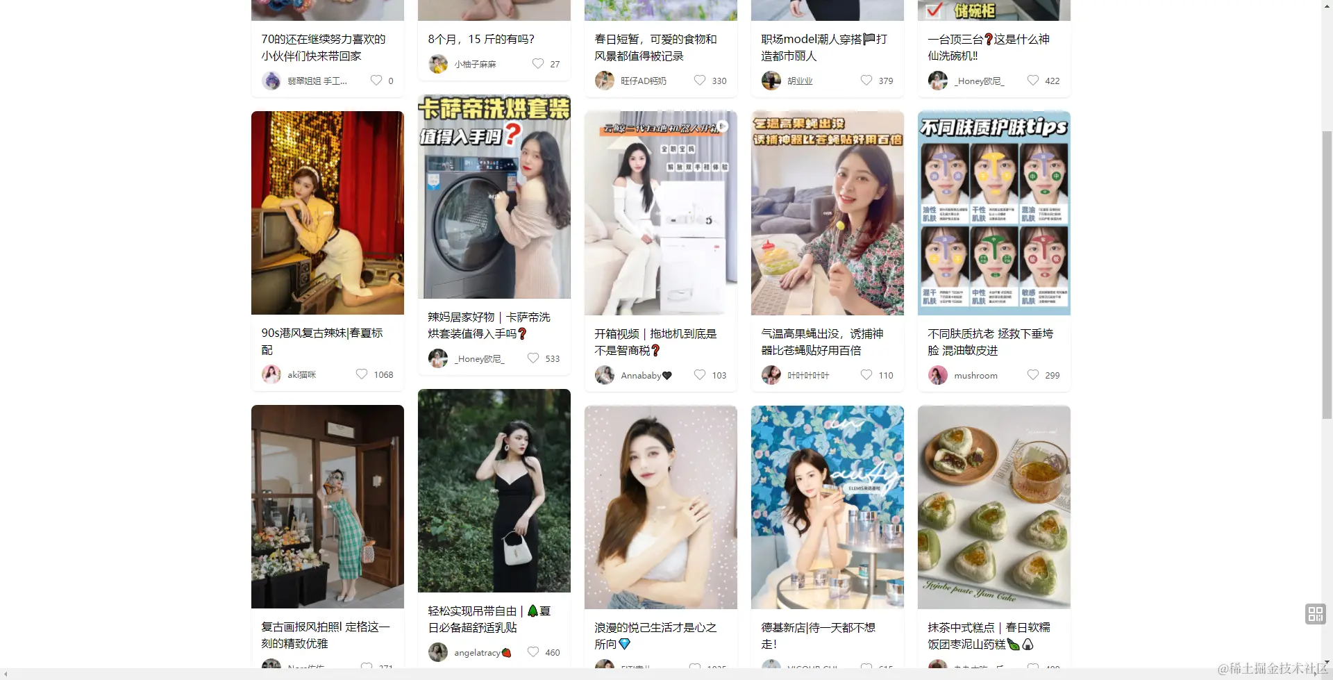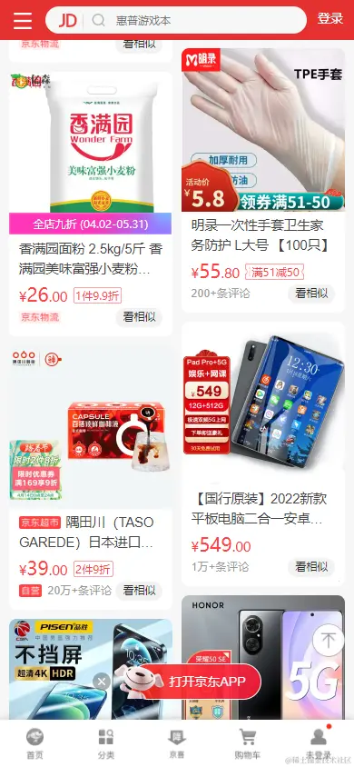 如今,瀑布流布局已经在很多网站中得到应用,比如小红书、京东等平台我们都能找到瀑布流的身影,如图: