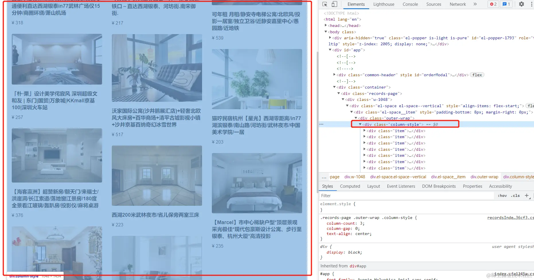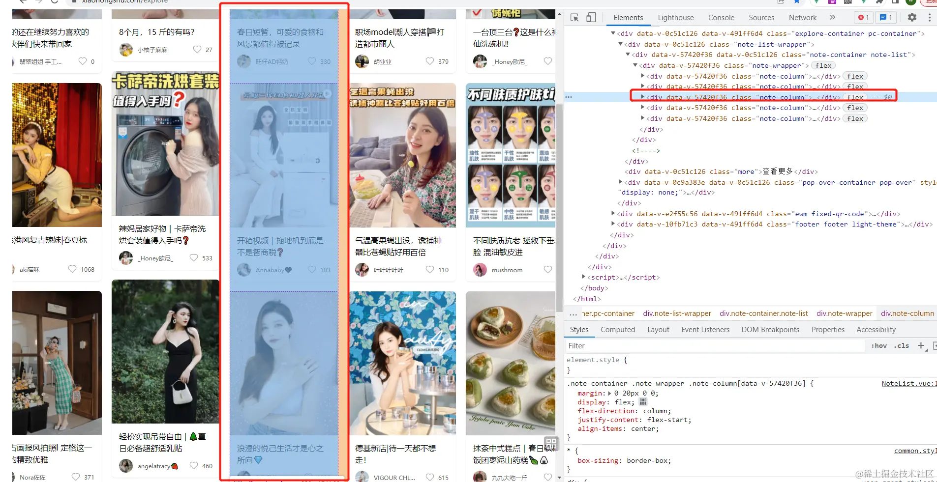 但是我们这一小节的瀑布流方案与小红书不一样,使用 css3 的 column 属性来布局,这种方式更简洁易用,并且减少 DOM 嵌套,如图所示,最外层只需要一个 div 就可以实现瀑布流: