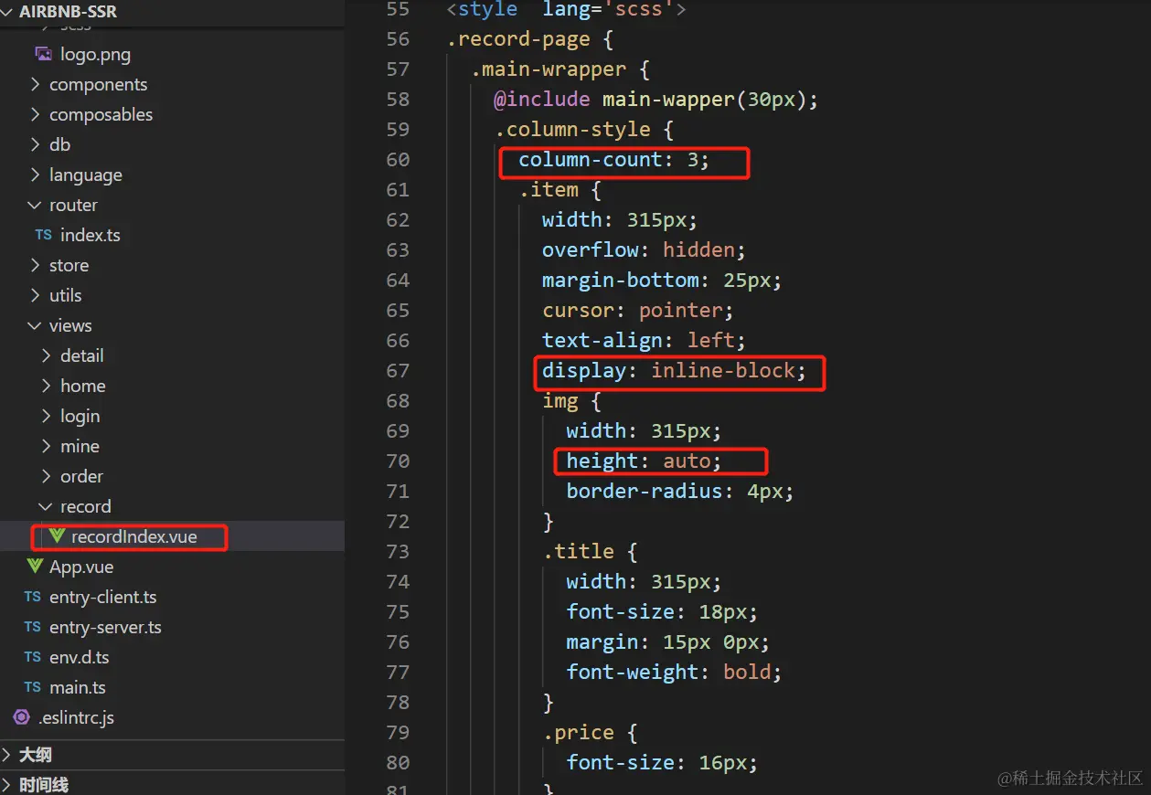具体代码片段如图如下,老师将最重要的是三个样式属性标红圈起来了,它们是实现瀑布流的关键样式: