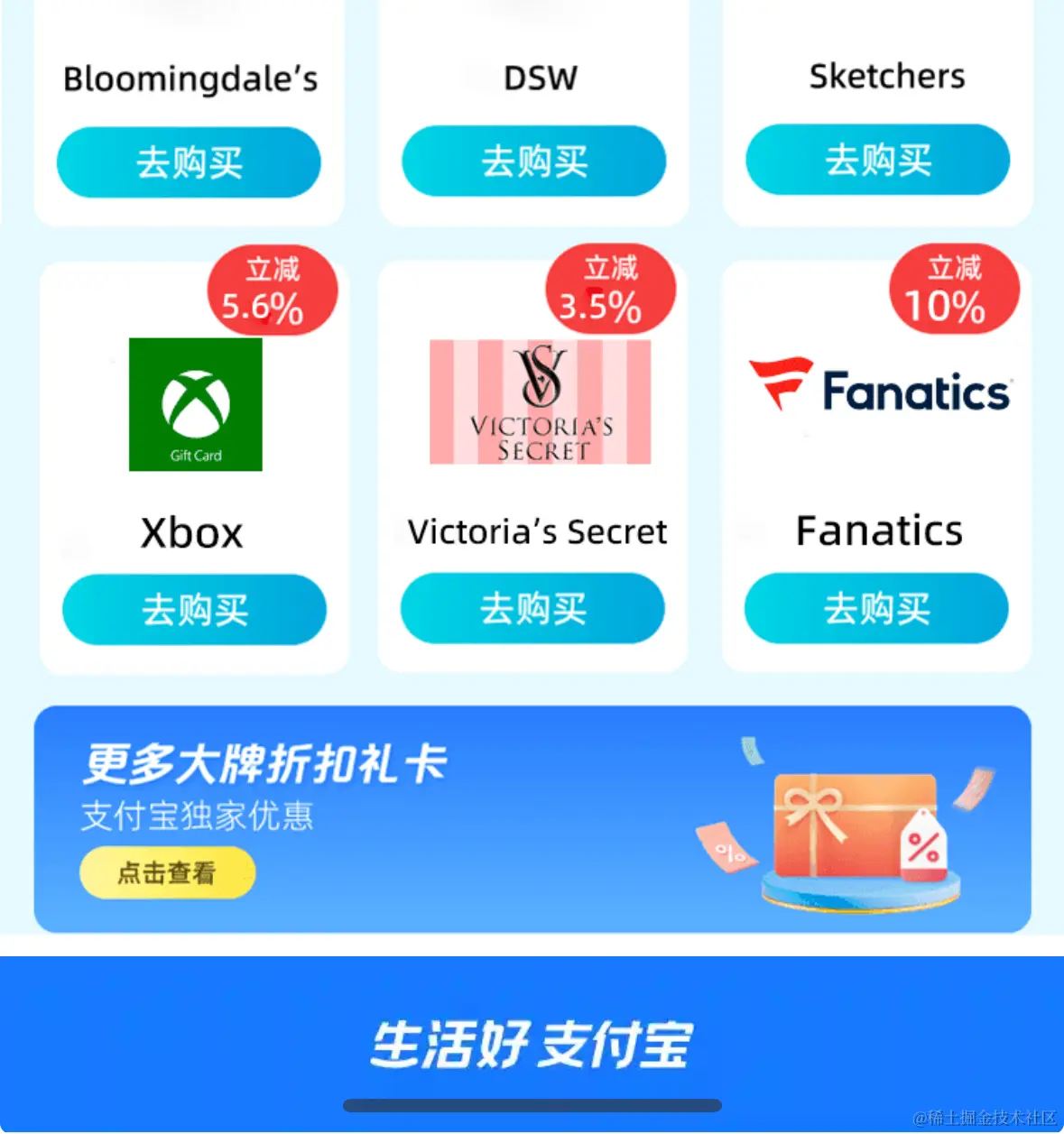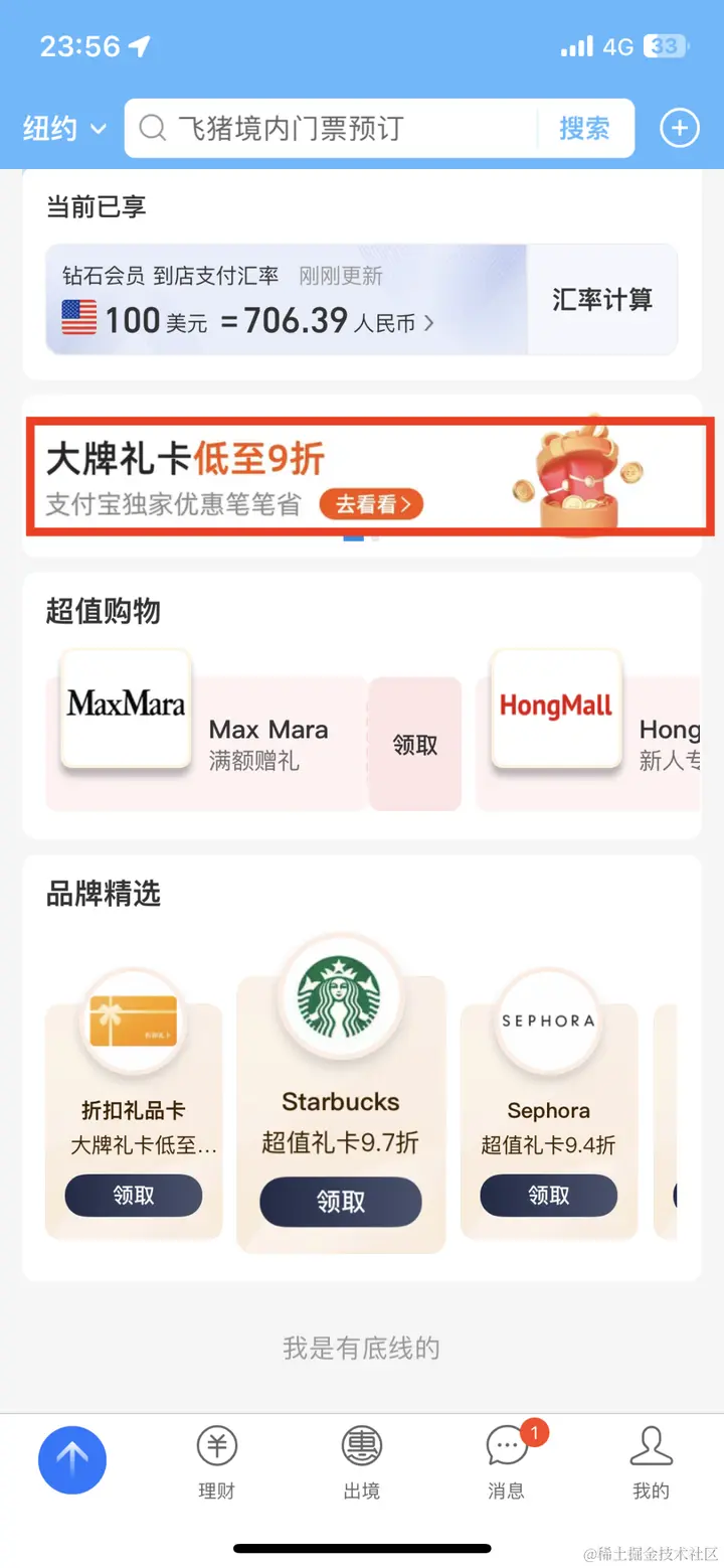 然后回到首页,拉到最底部,有个大牌礼卡低至 9 折的 Banner