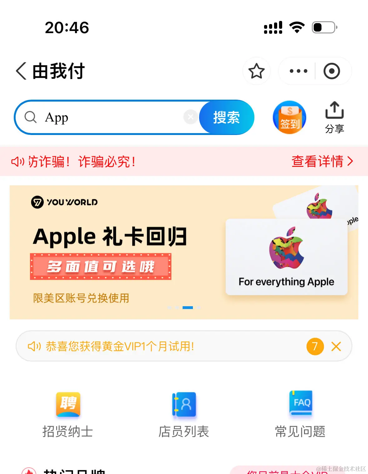 点进去之后,再点更多大牌折扣礼卡,进入由我付小程序,在搜索框中搜索 App