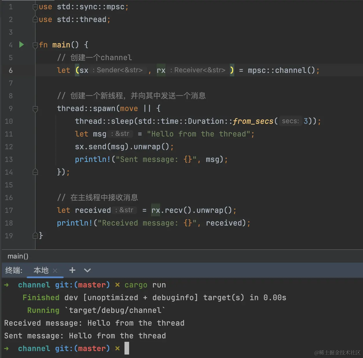 以下是一个使用channel在两个线程间发送和接收消息的简单例子: