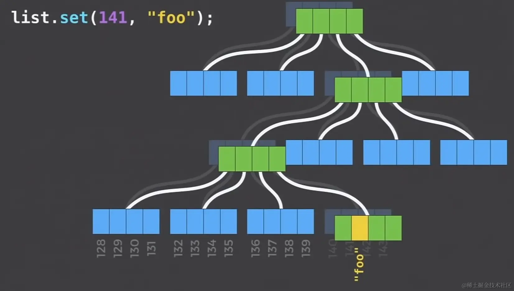 然后我们看 set 操作,set 会返回一个全新的数组(图中绿色部分),对于未改变的部分则继续使用原有的节点,而对于需要改变的部分则改变对应的叶子节点及其全部父节点,返回一个新的 list 对象。
