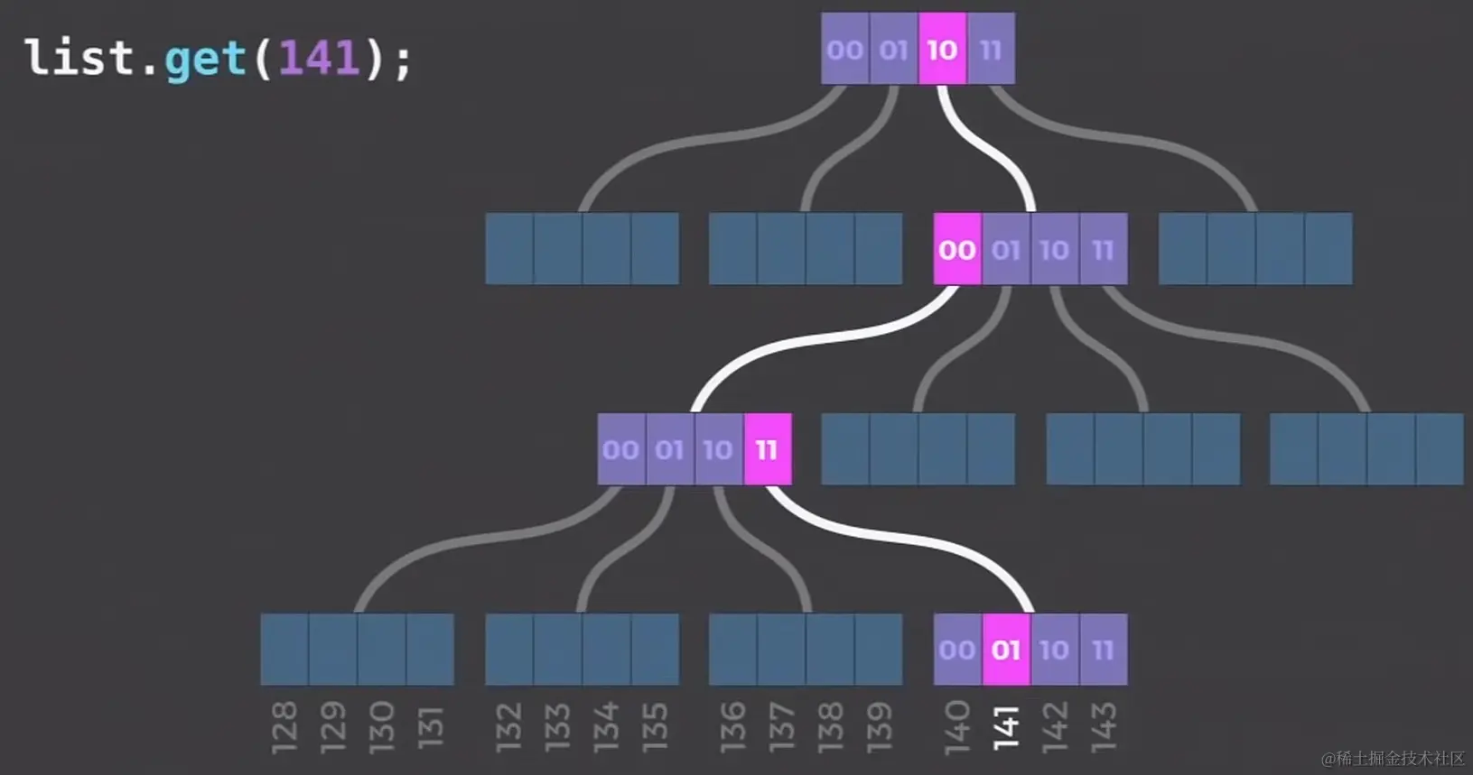 先看 get 操作,这里我们直接使用了 React.js Conf 2015 中的图片,kotlin 与其设计结构事实上是一样的(但默认 shift 为 5)。