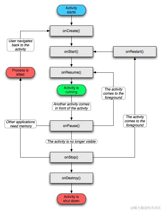 Google给了我们一张图来表示Activity的生命周期,他希望Activity能被开发者所控制,而不是一匹脱缰的野马。