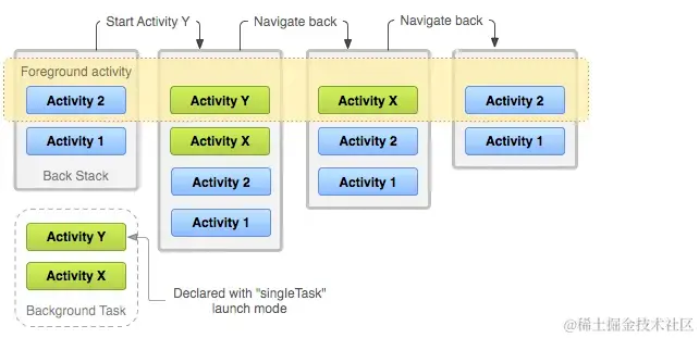 当Activity2启动ActivityY的时候(启动模式为singleTask),他所在的task被切换到前台,且按返回键返回的时候,也会先返回ActivityY所在Task的Activity,这一点比较难理解,大家根据图去研究一下。