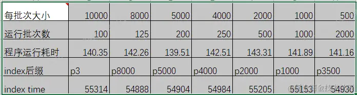 我在虚拟机环境实测了7种不同批次的大小,从500到10000都有。