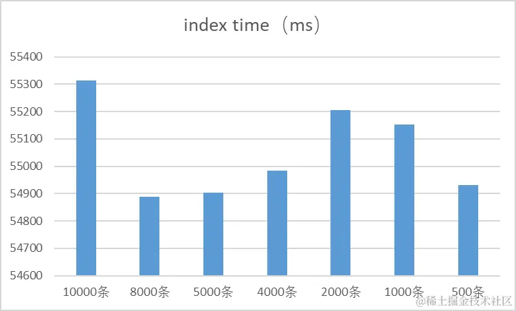 这图看着很唬人,实际上设定不同的批次大小对写入性能的影响微乎其微,图中所示的数据索引时间单位是毫秒。