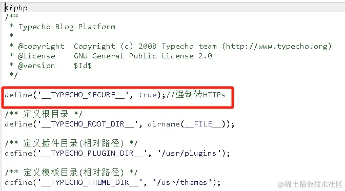 网络上的解决方案,编辑 Typecho 站点根目录下的文件 config.inc.php,文件开始添加一行代码,强制转向https。
