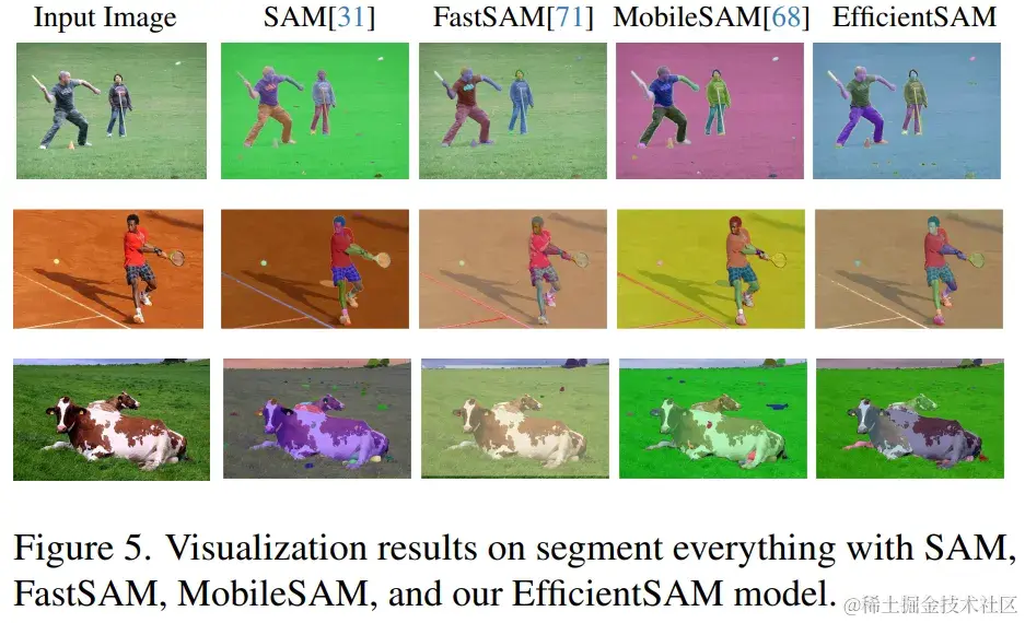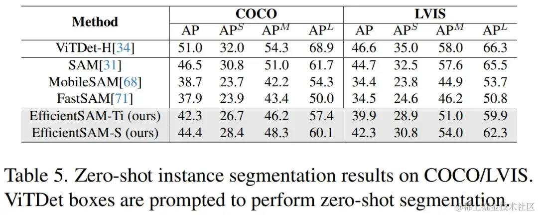 表 5 展示了零样本实例分割的 AP、APS、APM 和 APL。研究者将 EfficientSAM 与 MobileSAM 和 FastSAM 进行了比较,可以看到,与 FastSAM 相比,EfficientSAM-S 在 COCO 上获得了超过 6.5 个 AP,在 LVIS 上获得了 7.8 个 AP。就 EffidientSAM-Ti 而言,仍然远远优于 FastSAM,在 COCO 上为 4.1 个 AP,在 LVIS 上为 5.3 个 AP,而 MobileSAM 在 COCO 上为 3.6 个 AP,在 LVIS 上为 5.5 个 AP。