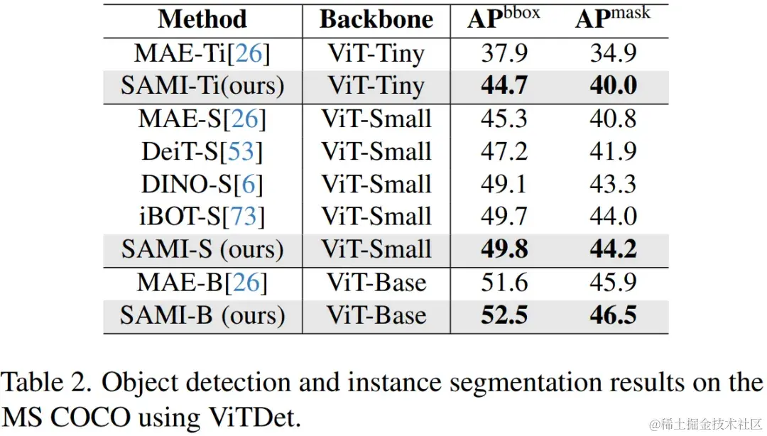 目标检测和实例分割。本文还将经过 SAMI 预训练的 ViT 主干扩展到下游目标检测和实例分割任务上,并将其与在 COCO 数据集上经过预训练的基线进行比较。如表 2 所示, SAMI 始终优于其他基线的性能。